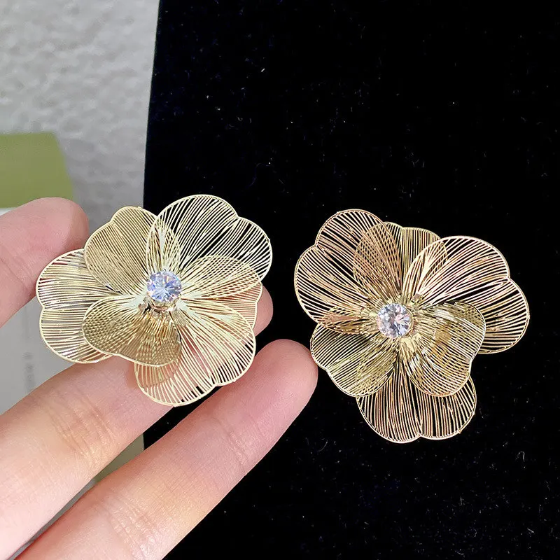 2024 Fashion Hollow Gold Color Metal Earrings for Women Large Exaggerated Flower Stud Earrings Jewelry Gifts Wholesale